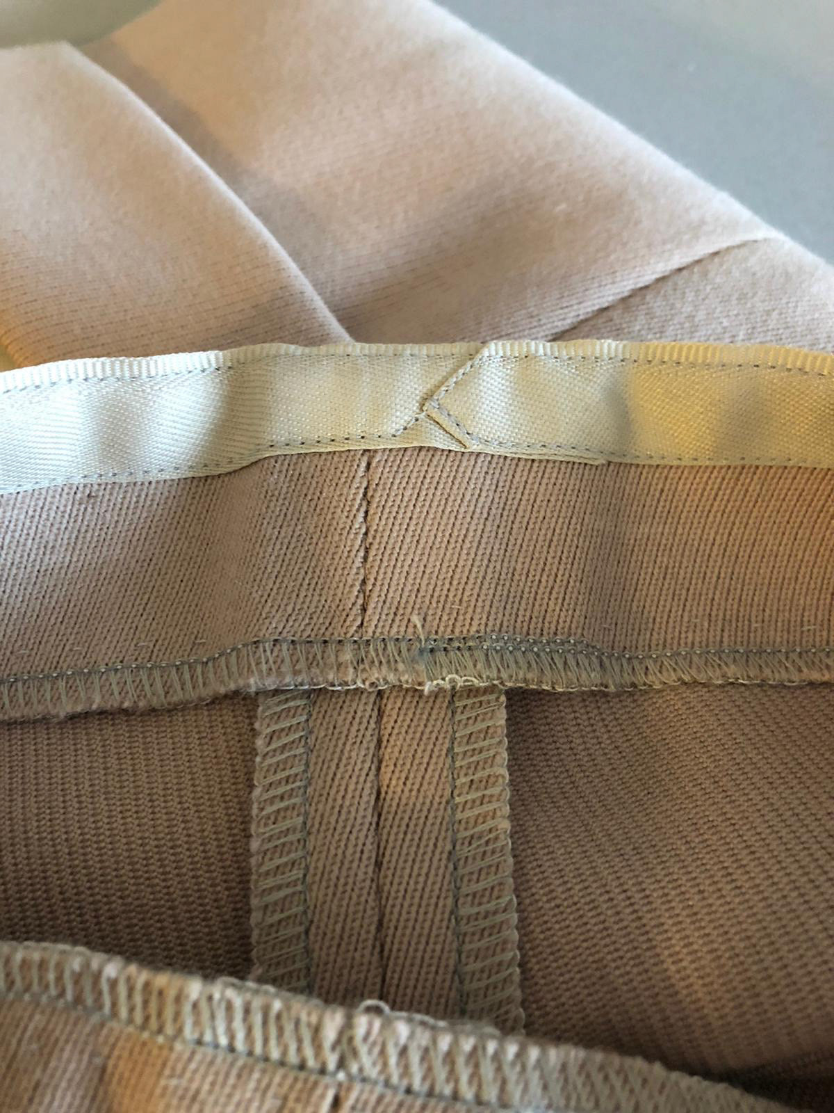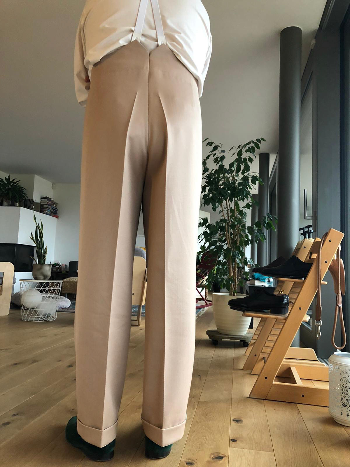 Pants with two inward pleats and a continuous waistband.